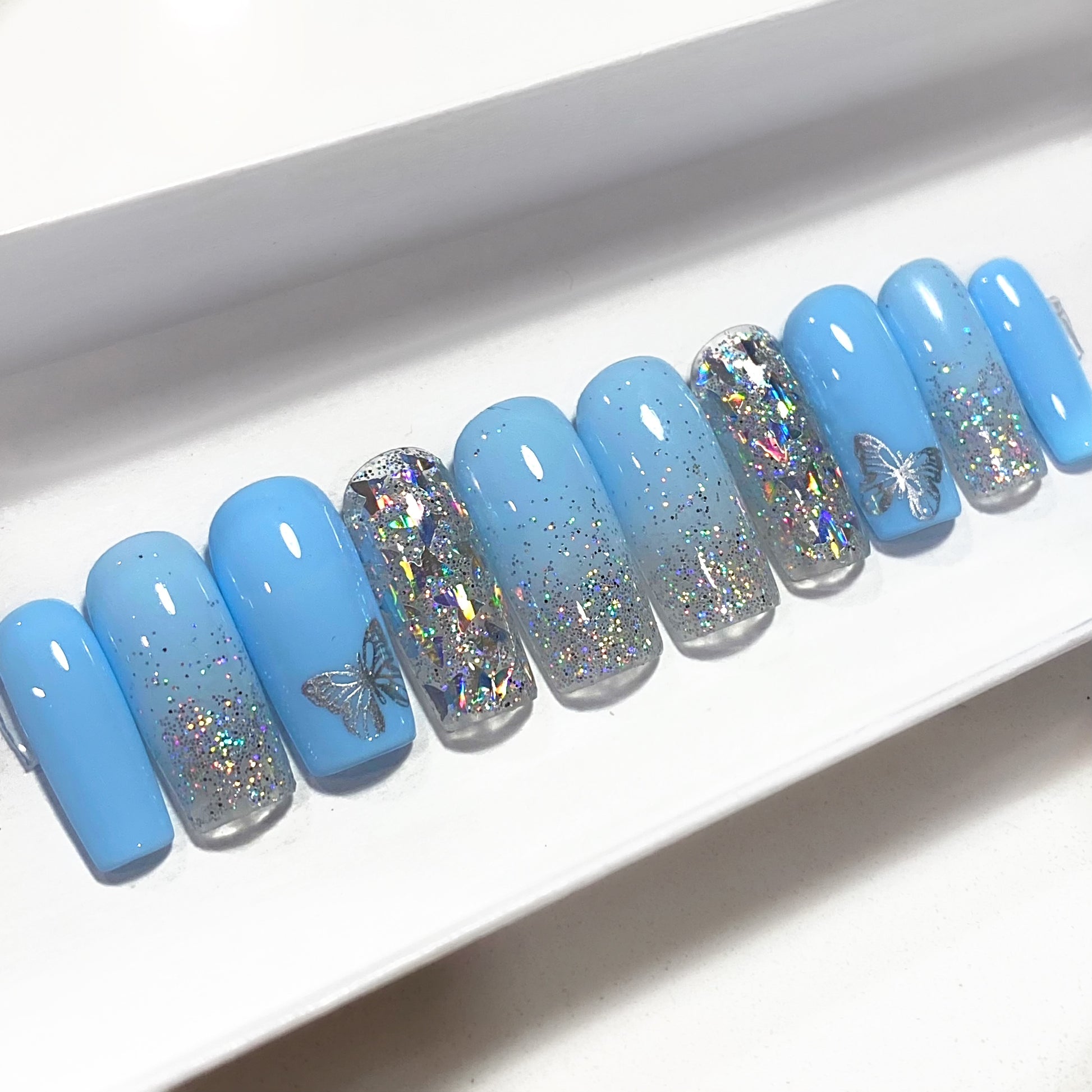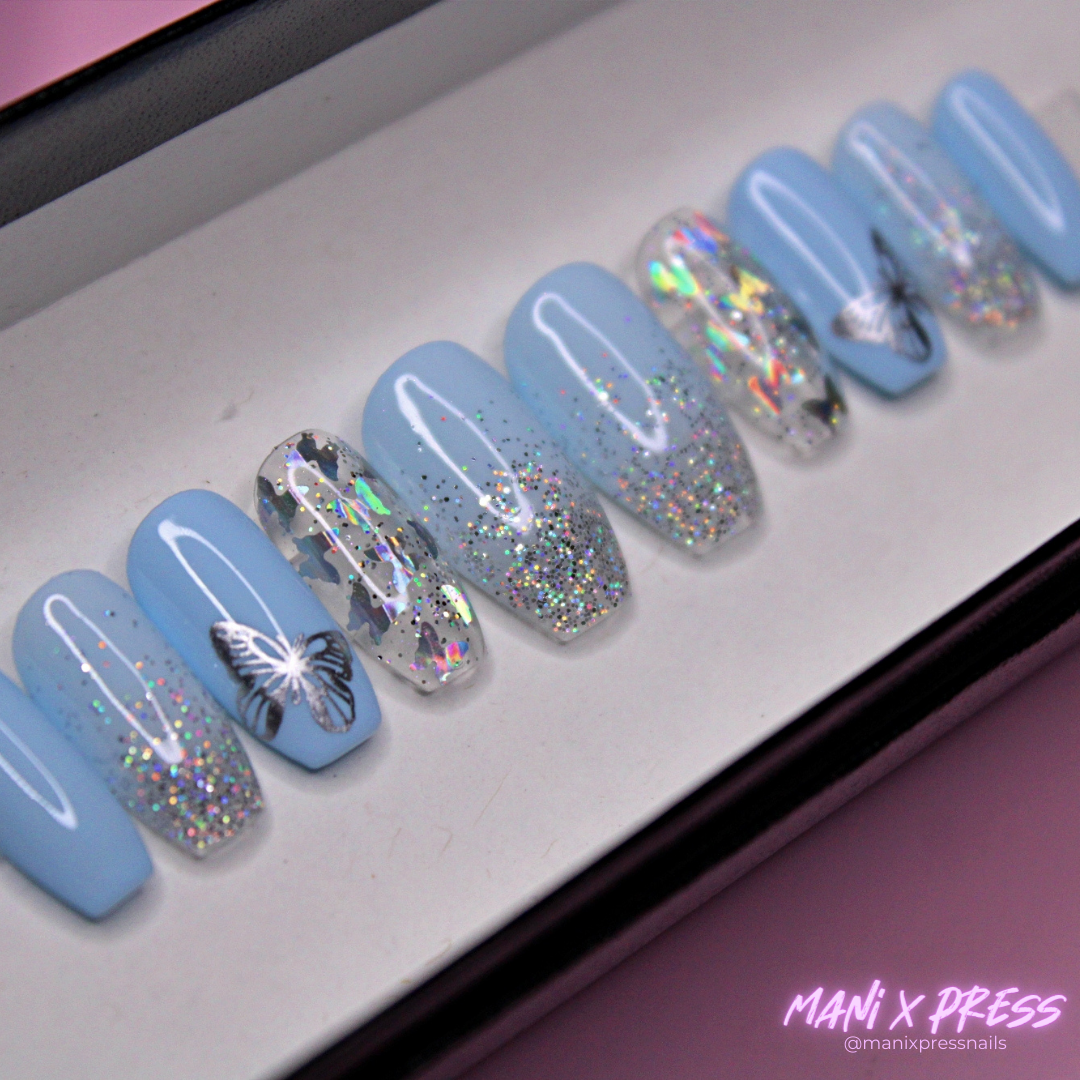 LIGHT BLUE HOLOGRAPHIC BUTTERFLY OMBRE PRESS ON NAIL SET
