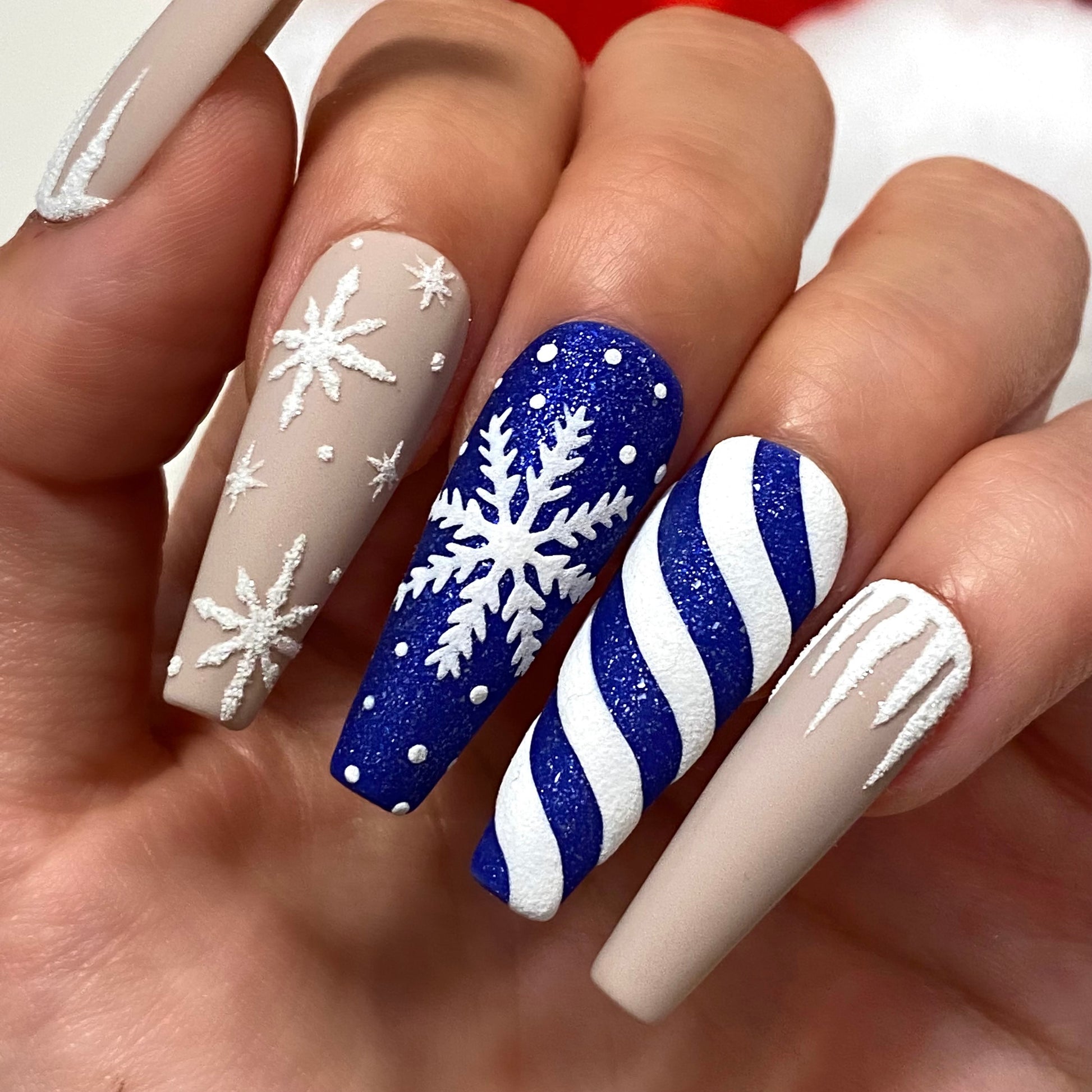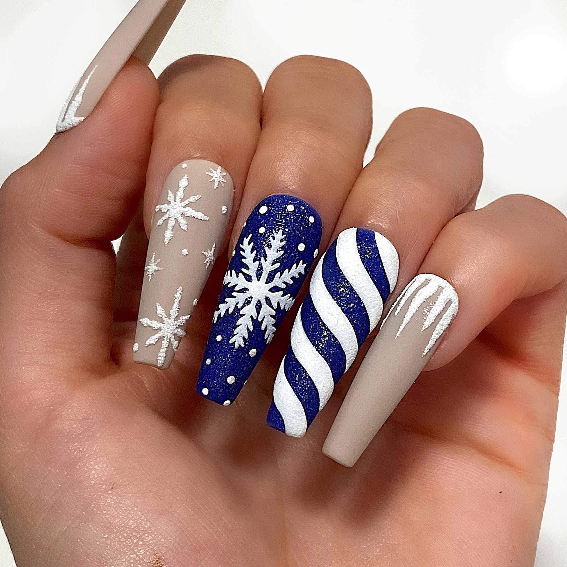 Blue and grey snowflake candy cane press on nail set