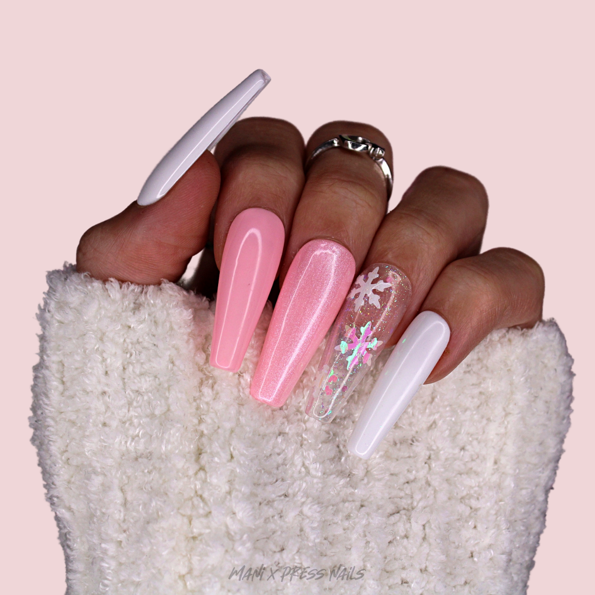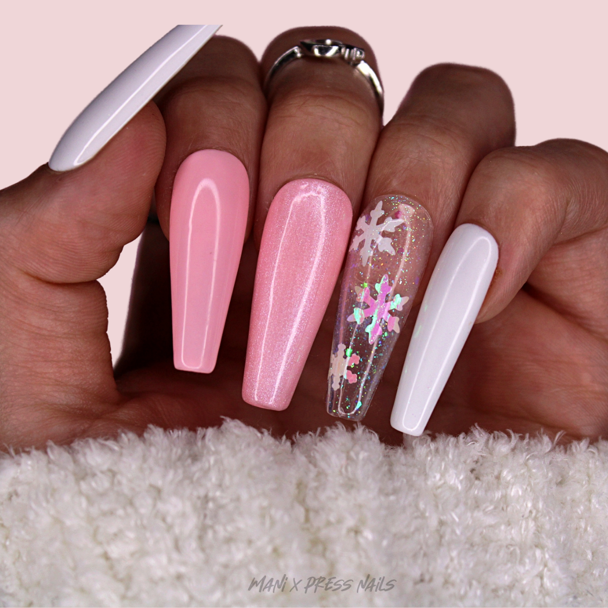 WHITE AND PINK PRESS ON NAIL SET WITH IRIDESCENT SNOWFLAKE ACCENTS