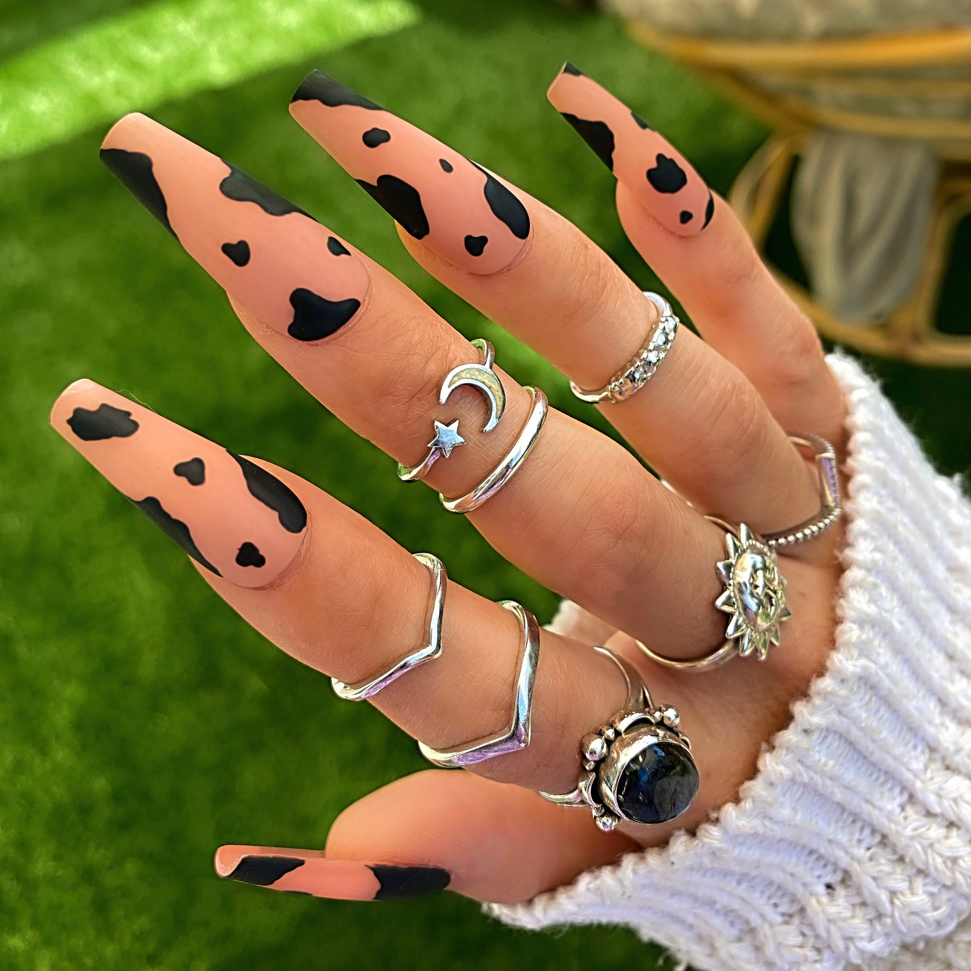 Warm medium nude with black cow print design press on nails