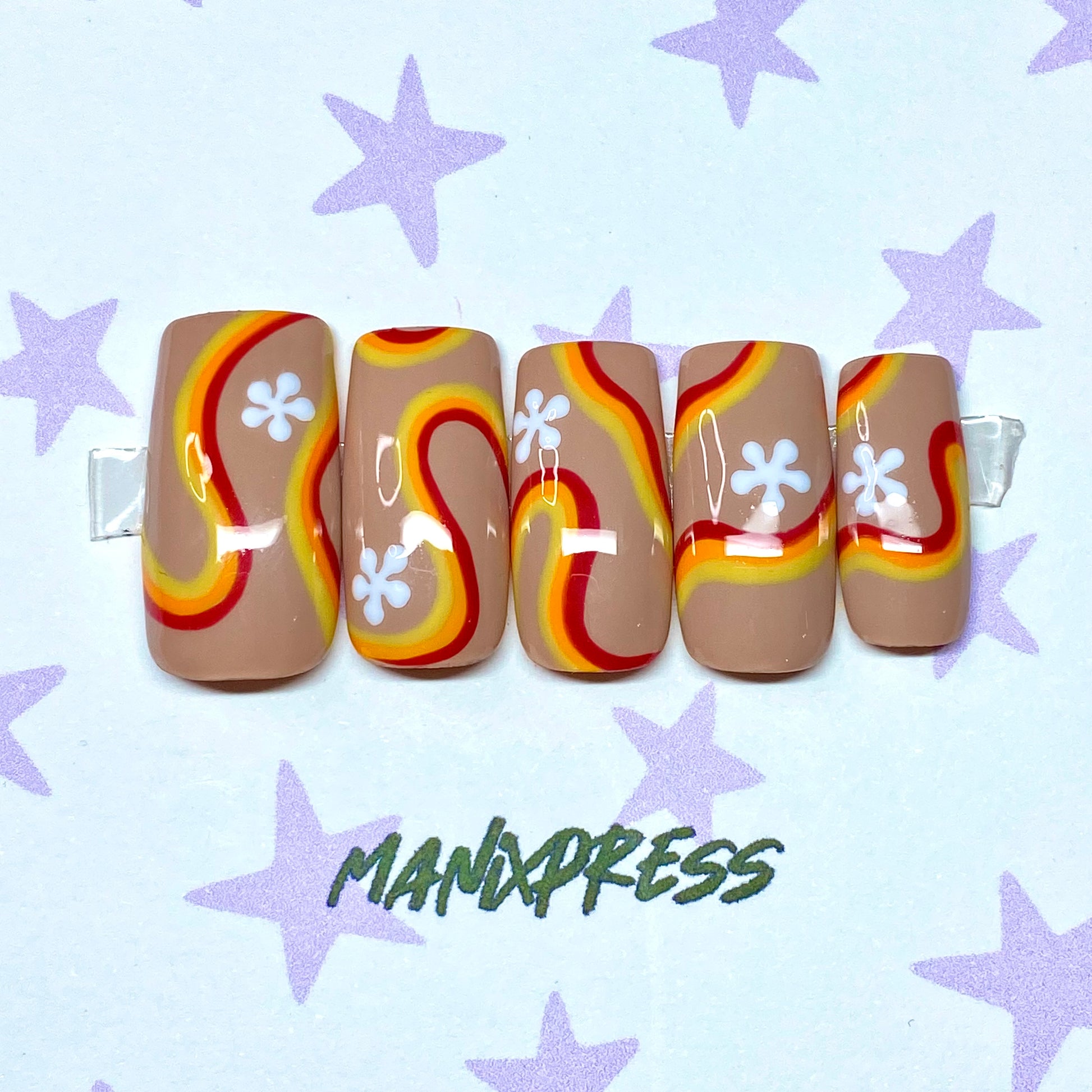 Red, orange, yellow and flower groovy abstract press on nails