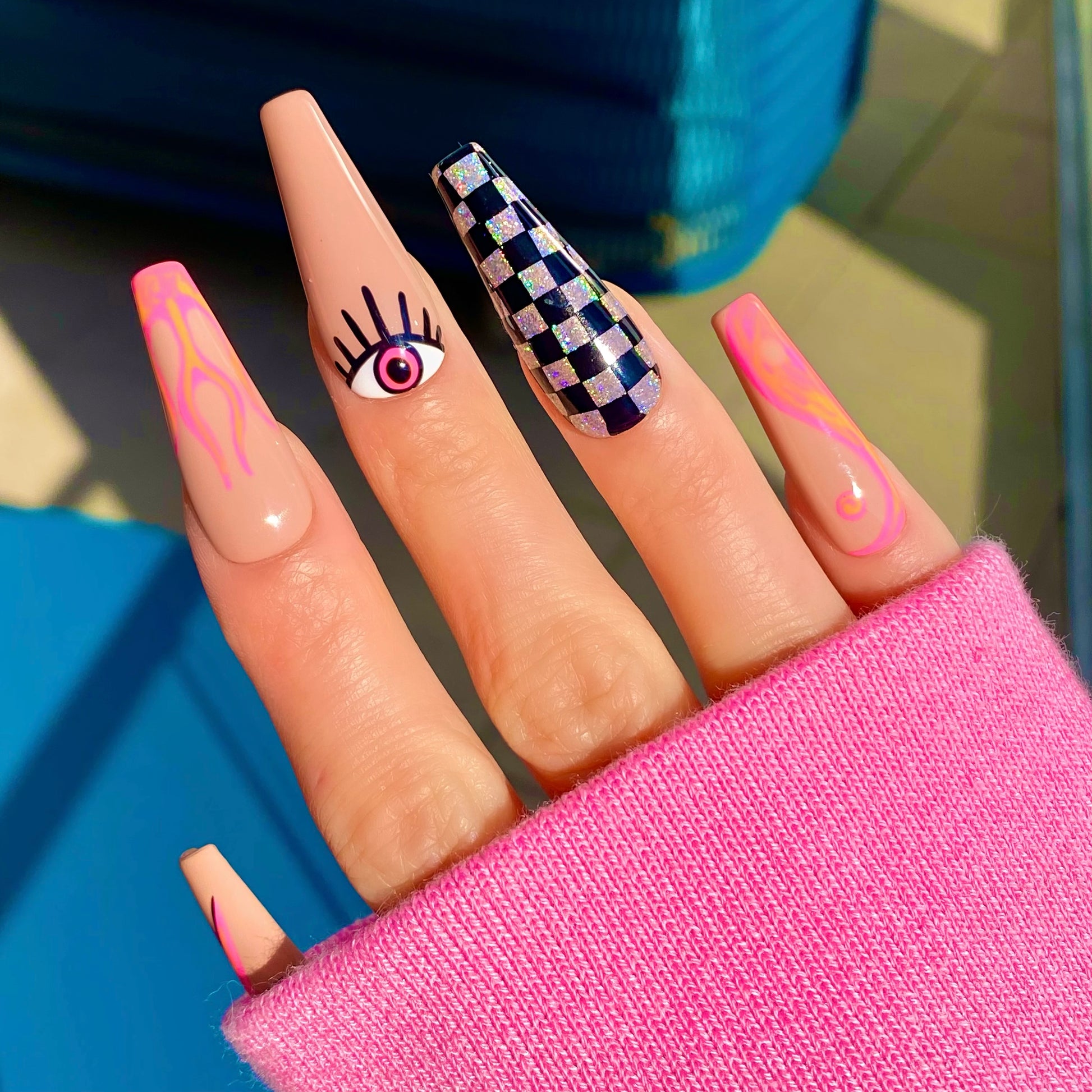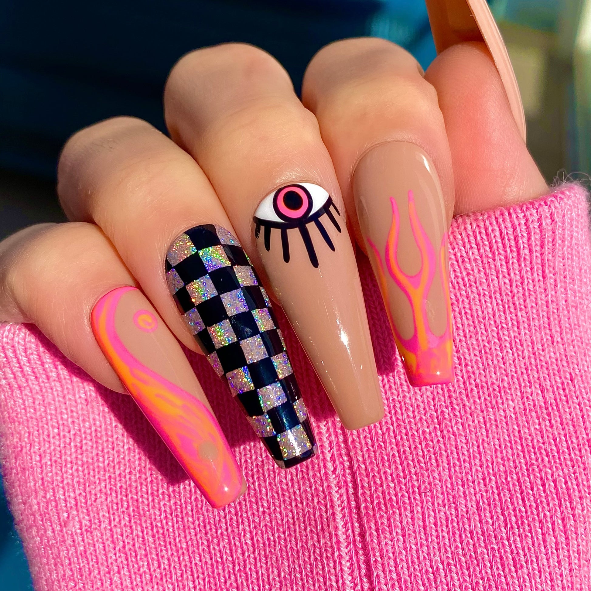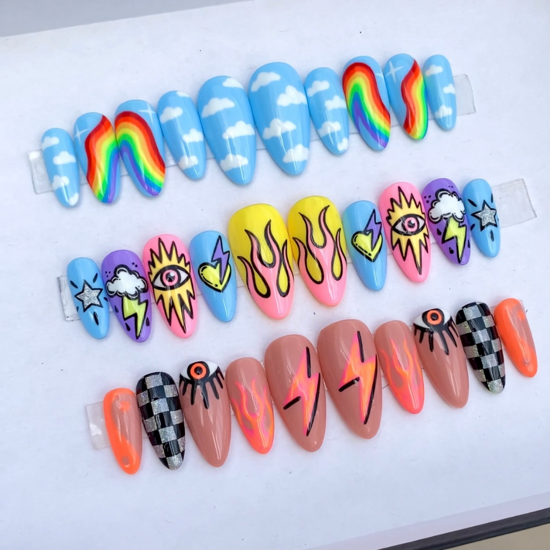 Pop art, thundercloud, eye, checkered, lightning, and yin yang press on nail set
