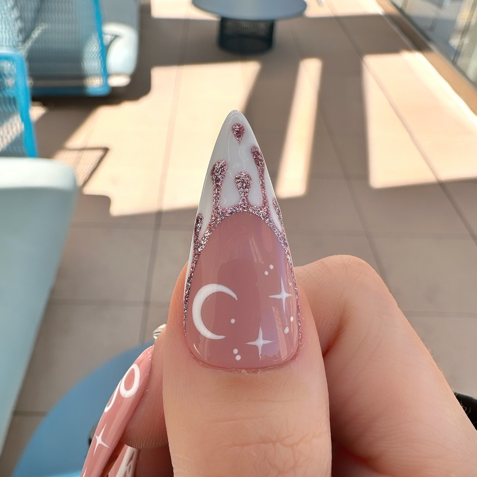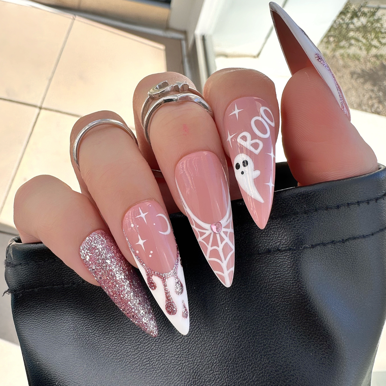 Glitter Pink & White Halloween Press-On Nails: French Tips, Ghosts, Moons, & Blood Drip