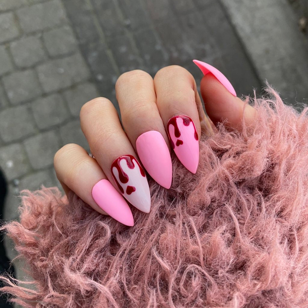 BARBIE PINK AND BLOOD DRIP PRESS ON NAIL SET