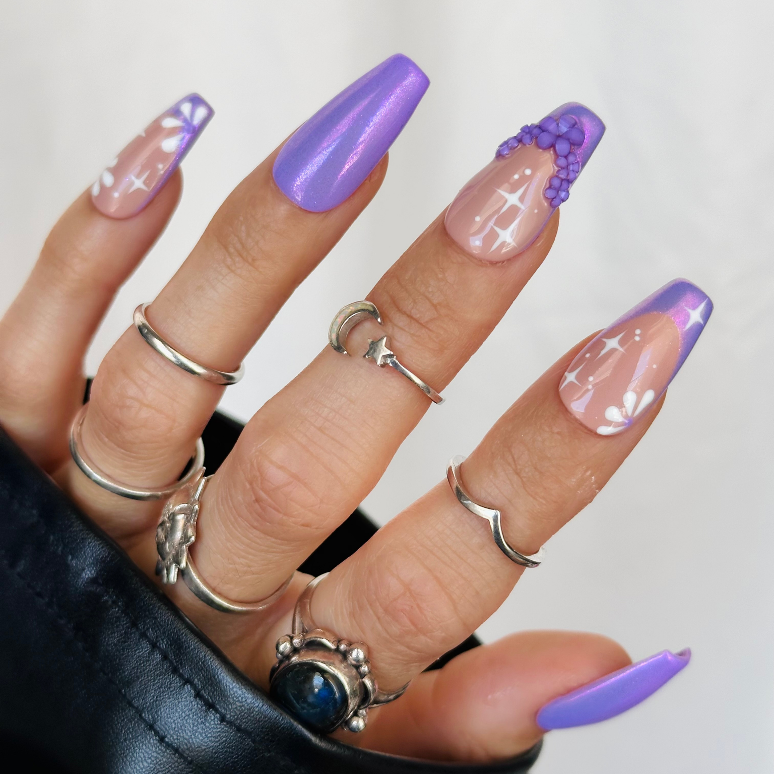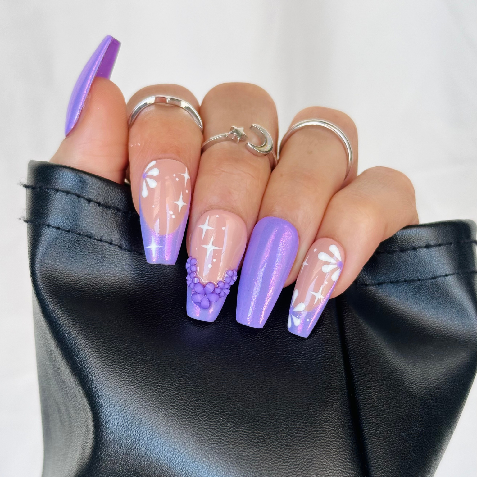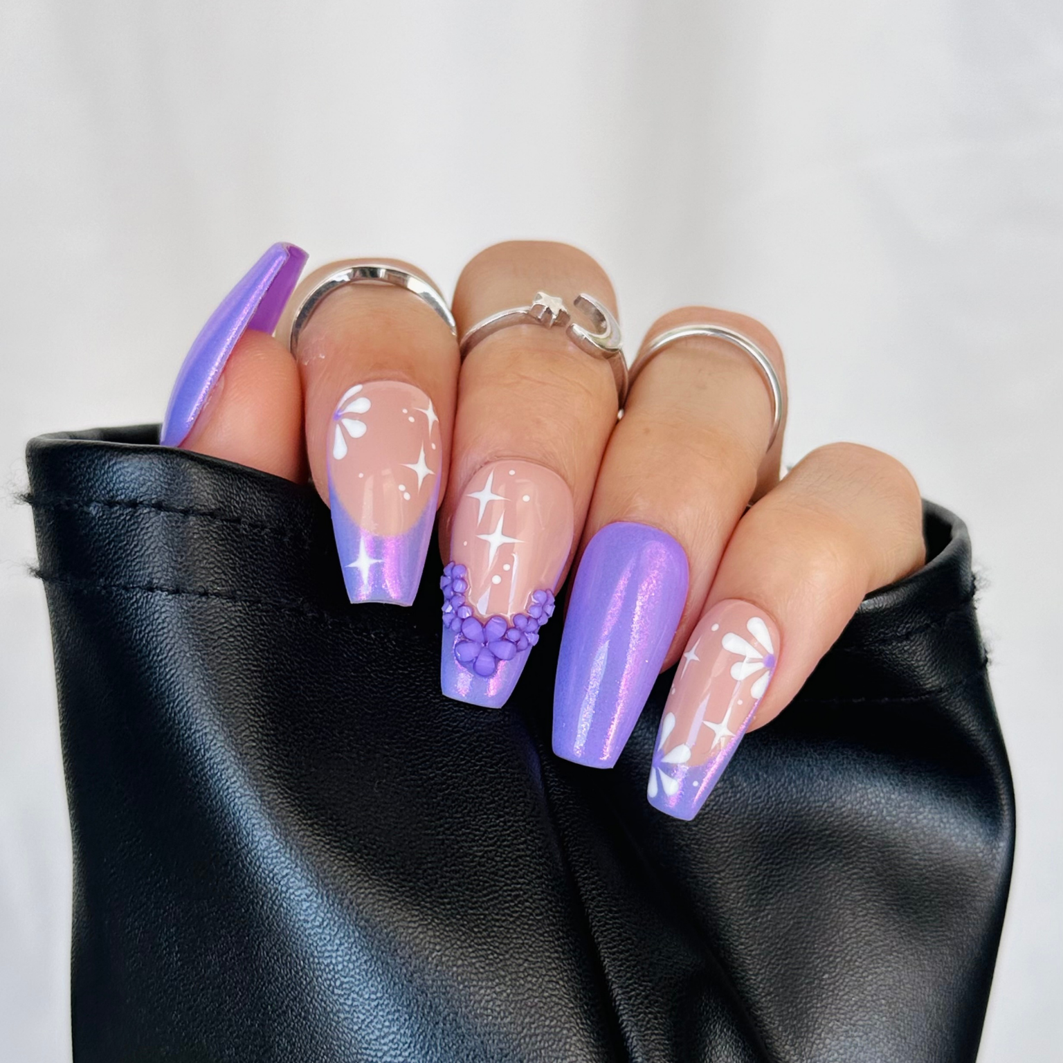 Daisy flowers, stars, iridescent lilac/purple, and French tip press on nail set