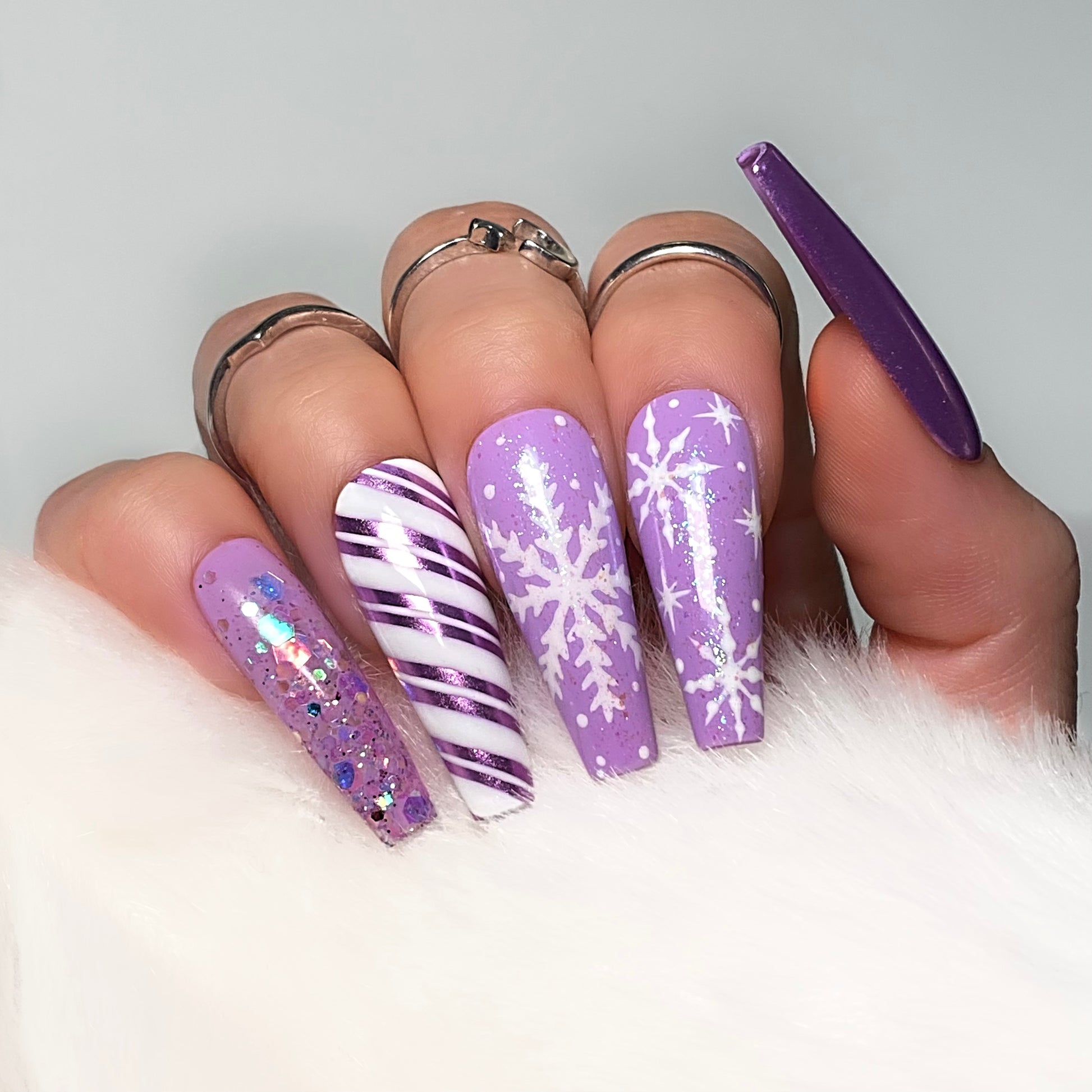 Purple and lavender glitter, snowflake, candy cane press on nail set