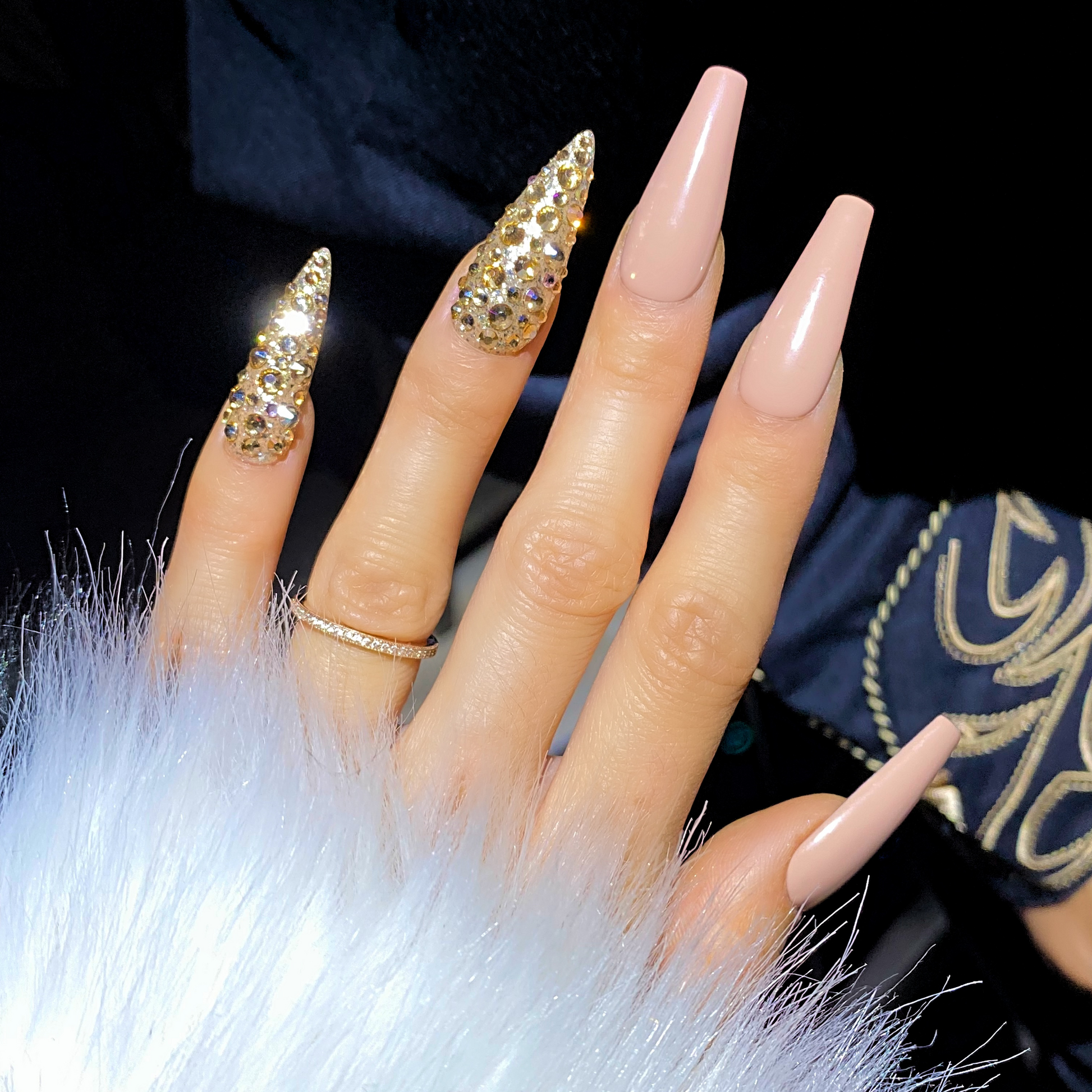 Sparkle brings a touch of glamour to your manicure with its hand-made press-on nails featuring nude bases with gold and diamond accents. Perfect for elevating your look and making a lasting impression.